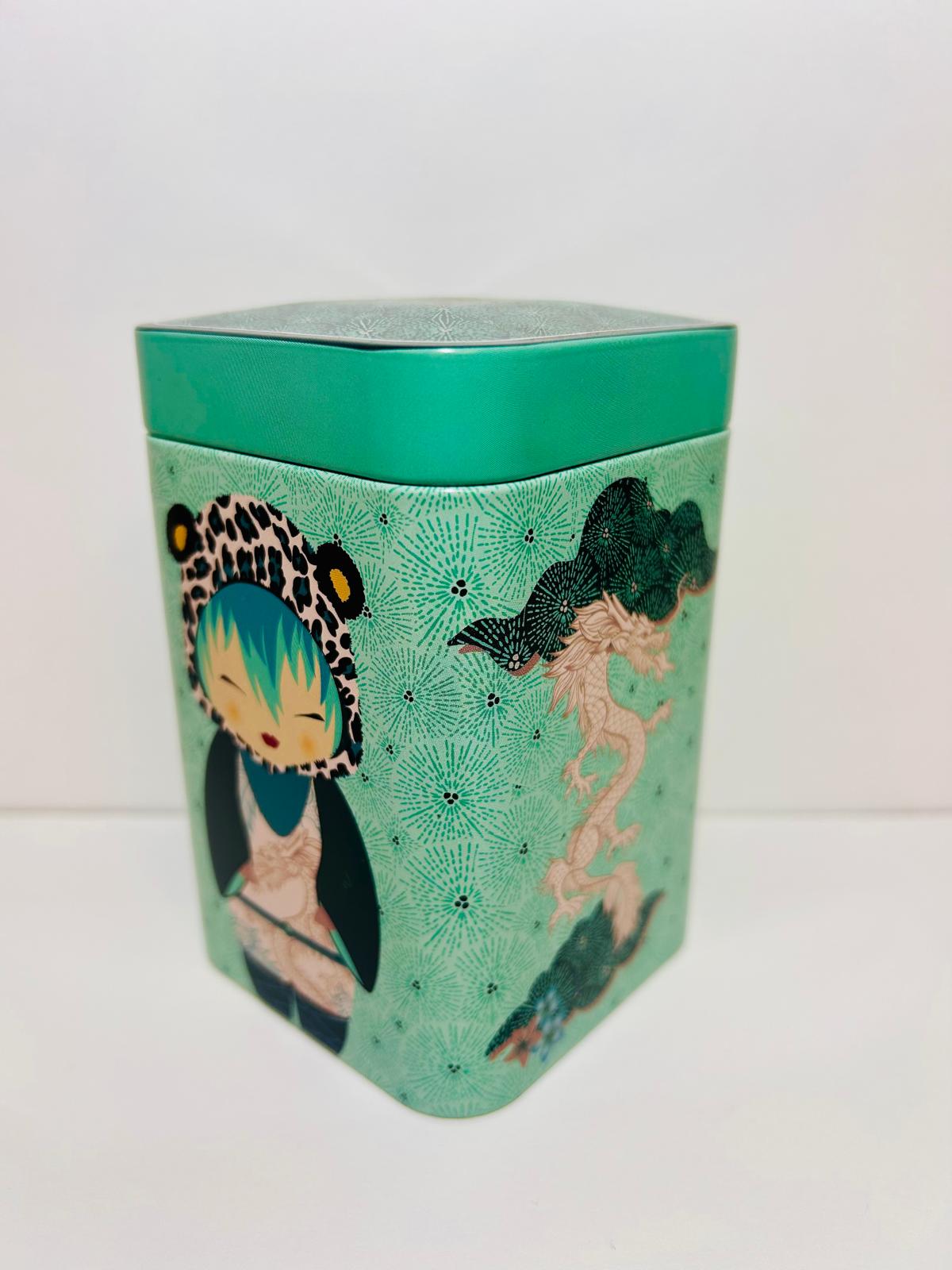 Boîte à thé hermétique en métal au design japonais moderne, dans un élégant vert émeraude, décorée d’un personnage stylisé et d’un dragon délicat. Idéale pour conserver vos thés en vrac avec style et efficacité.