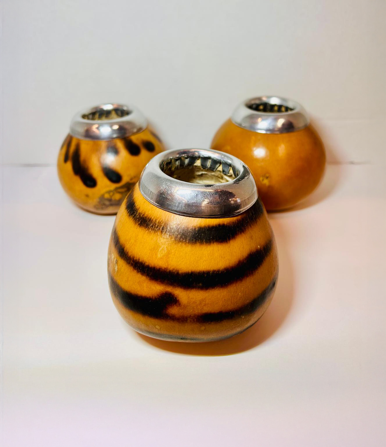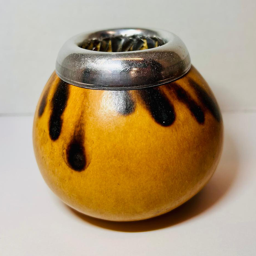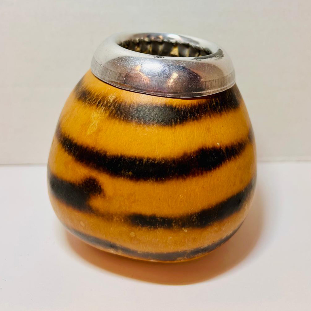 Calebasse à maté naturelle avec finition tigrée et bord en métal. Idéale pour déguster votre yerba maté de manière traditionnelle et authentique.
