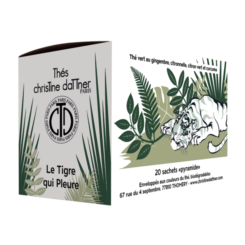 Le Tigre qui Pleure est un thé vert sencha de Chine aromatisé aux trois gingembres, au citron vert, à la citronnelle et au curcuma.