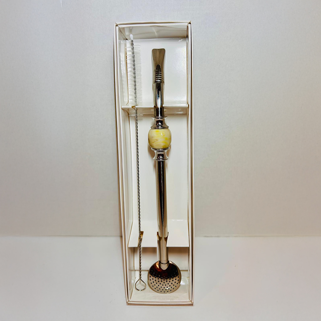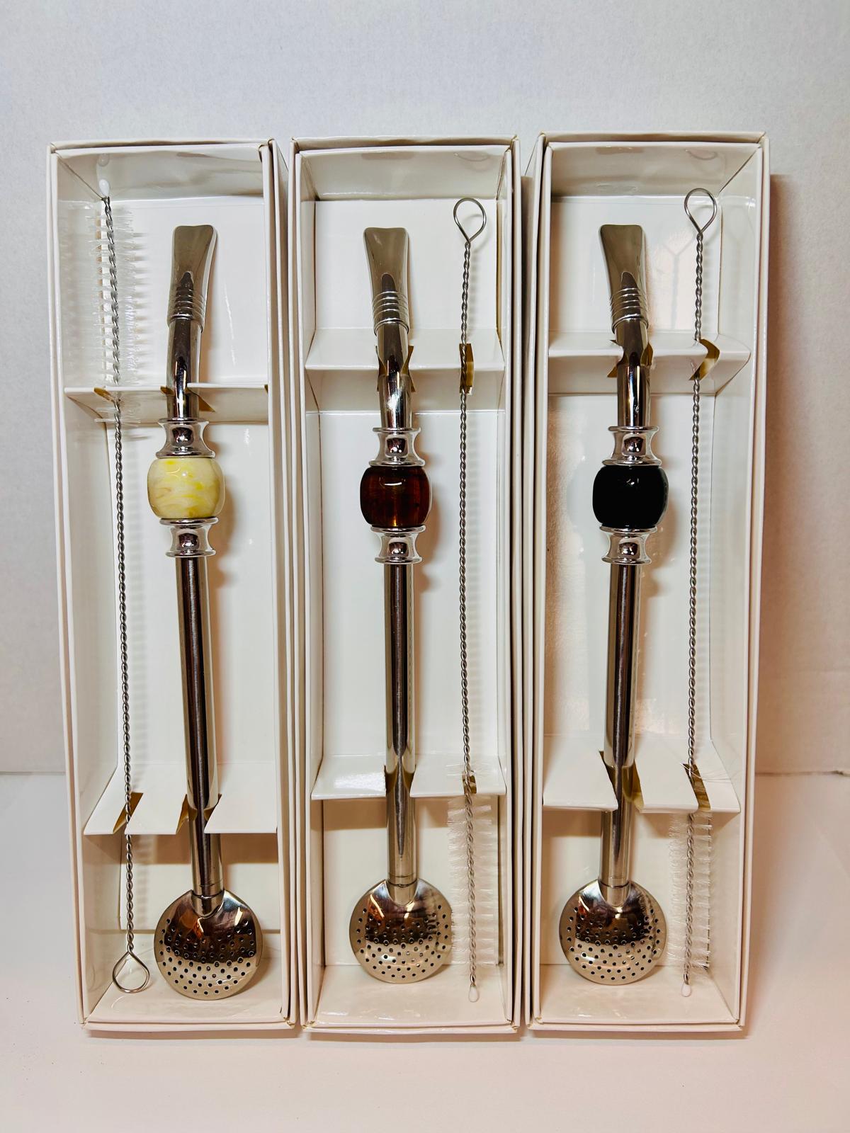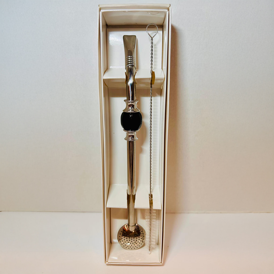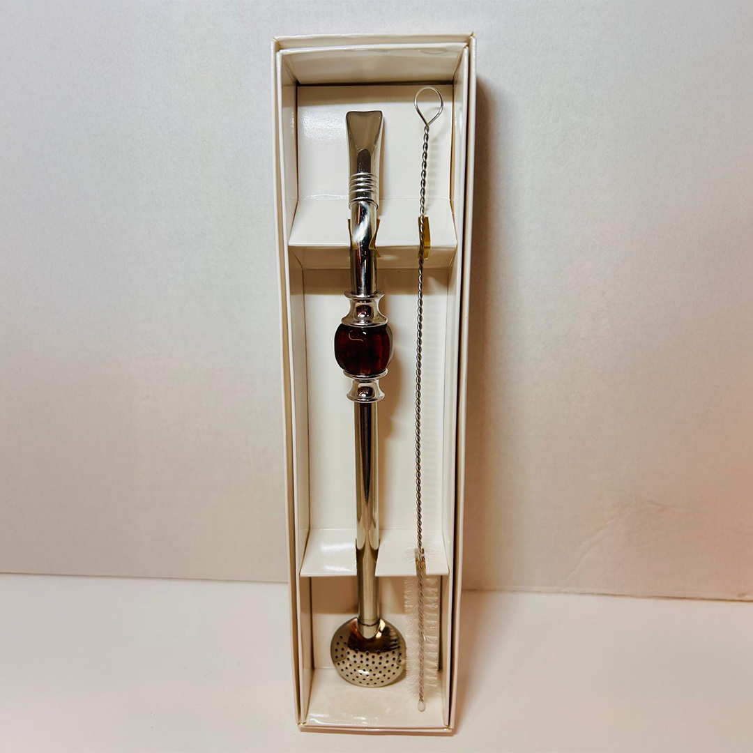 Paille à maté en inox avec filtre cuillère et brosse de nettoyage incluse, présentée en coffret élégant. Idéale pour une dégustation traditionnelle et propre du maté.