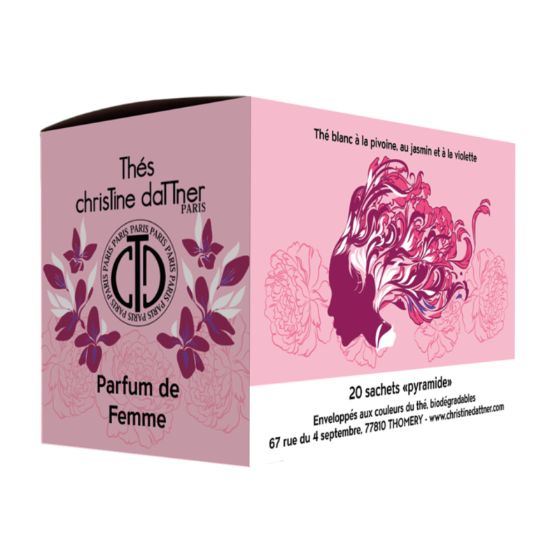 Parfum de Femme est un assemblage de thé blanc et vert aromatisés à la violette, au jasmin et à la pivoine.